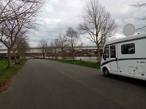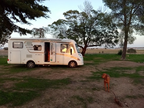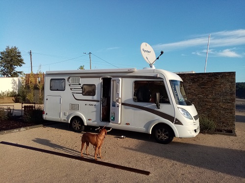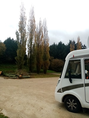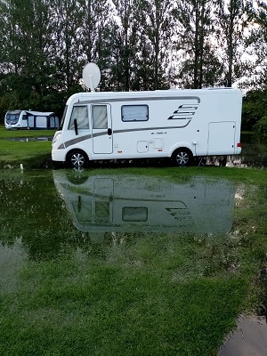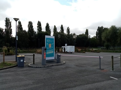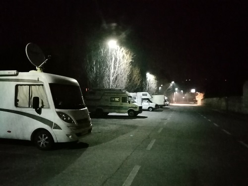 Large ex-field populated with about 90 European motorhomes. All services, though an upgrade would make a lot of sense.
