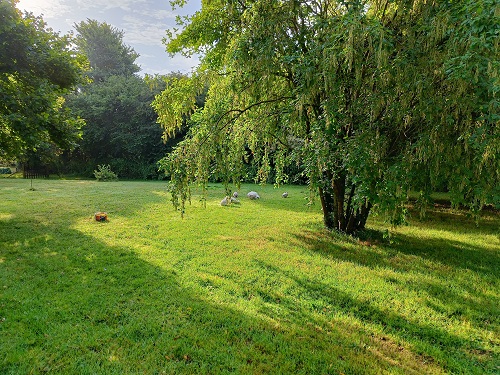 On a piece of green grass next to a restaurant. Sound of the waves brushing the beach.
