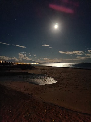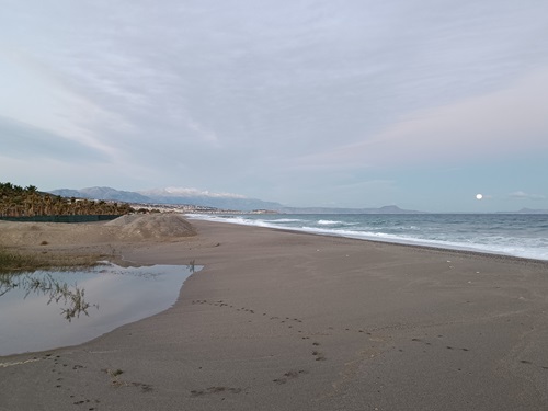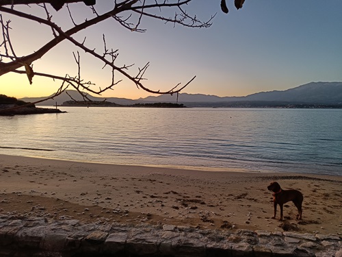 Almost every morning we walk along the beach, sometimes with lightening on the other side of the Med in Algeria.